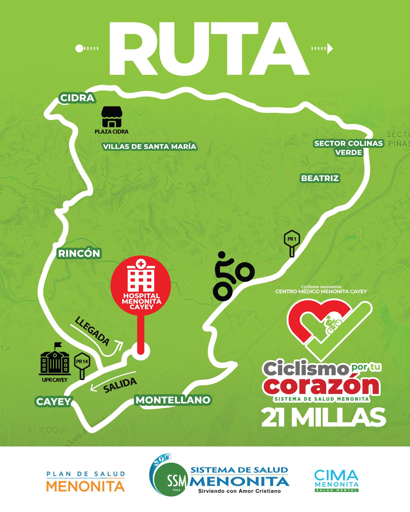 - Ruta: Una sola ruta de 34 kilómetros (21 millas) que recorre Cayey y Cidra. Salida a las 7:00 a.m. desde el Centro Médico Menonita Cayey. La ruta será por carretera.